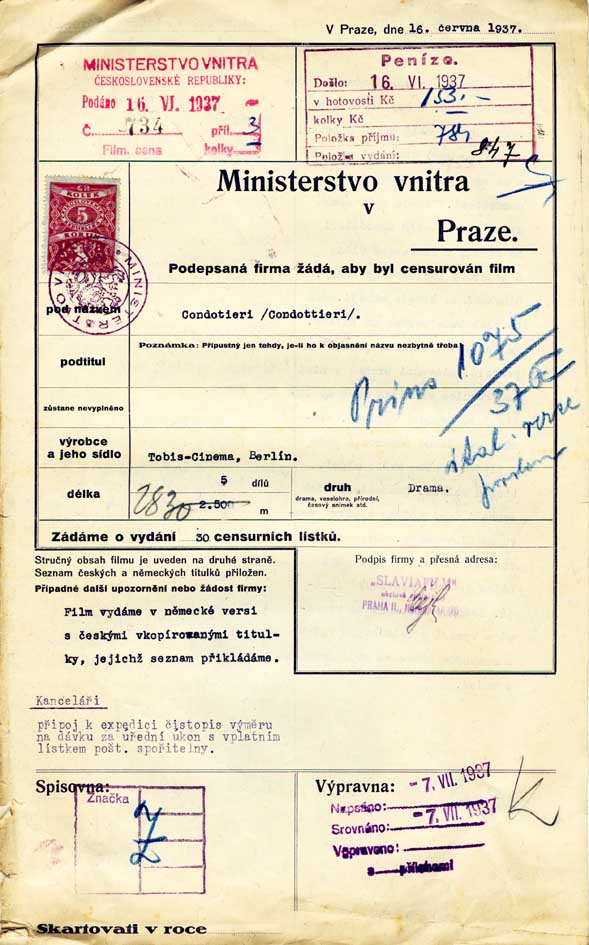 Description: Film distributing company applies for censoring of the film „Condotieri“. The film was completely interdicted.